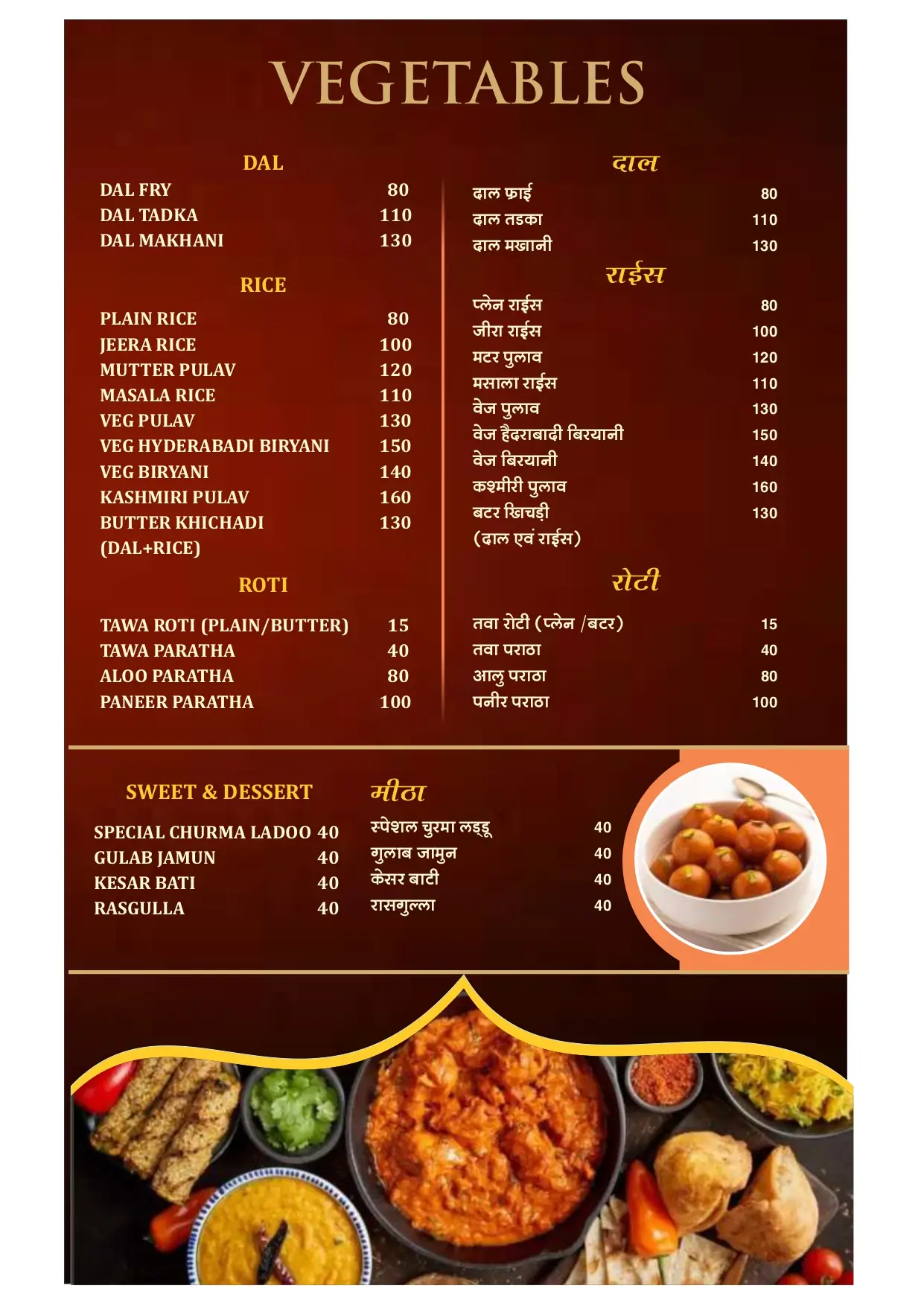 We honour the culinary traditions of Rajasthan: robust daals, freshly-rolled rotis, savoury seasonal vegetables and our signature daal-baati calamity of taste. We aim for meals that are wholesome, satisfying and memorable.We also understand the needs of travellers, families and local gatherings — providing quick service without compromising on flavour.